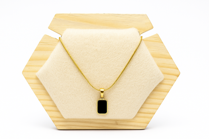 Bold rectangular black enamel pendant framed in radiant, anti-tarnish gold plating for lasting shine and durability